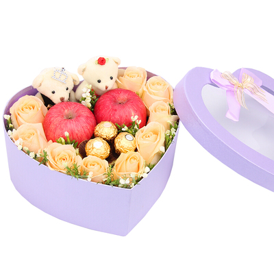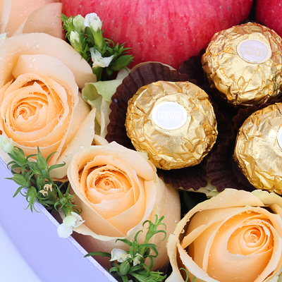 9朵香槟玫瑰,2个平安果,3颗费列罗巧克力,2只小熊,石竹梅搭配。