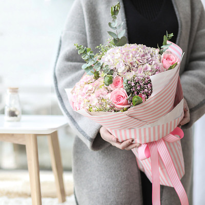 粉色条纹纸包装搭配粉色条纹缎带系结束扎花语:你的微笑藏在我心里,春风吹我为你动了情,明月照我思念着你,往事历历在梦里,今生注定爱着你,真心真意永不分离。附送: