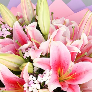 粉色加紫色平面纸叠角圆形包装,紫色加白色缎带系蝴蝶结束扎。花语:春风化雨暖透我的心,一生眷顾无言的地送赠。附送: