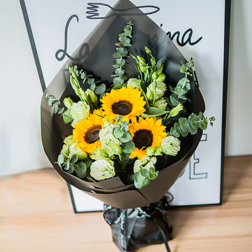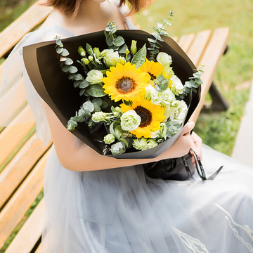内衬黑色雾面纸,外层黑色厚牛皮纸扇形包裹,黑色英文丝带束扎花语:岁月悠长,温暖如斯。喜欢你你脸上挂着的盈盈笑意,因为那像阳光一样,充满了我整个心窝....附送: