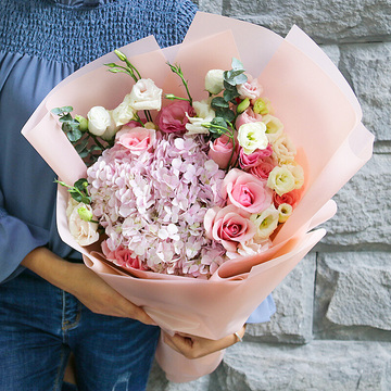 1朵粉绣球,7朵戴安娜粉玫瑰,3枝白桔梗1枝粉桔梗,尤加利叶(或栀子叶)搭配