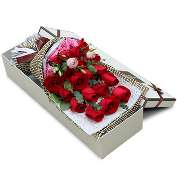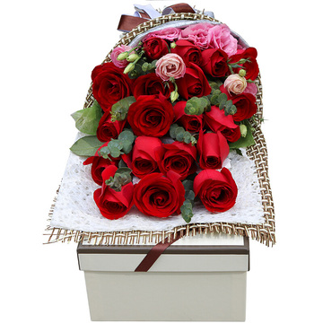 19朵红玫瑰,2枝粉桔梗,尤加利叶间插(没有用栀子叶代替)
