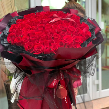 黑色雪梨纸内衬,外层红色欧雅纸圆形包装花语:允许我在你心里建一座美丽的小屋,千万别理会别人说是违章建筑。附送: