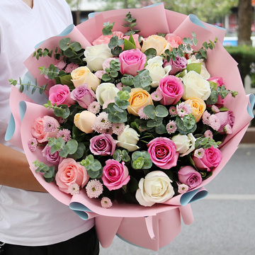 7朵苏醒,6朵海洋之歌,6朵戴安娜,5朵香槟,8朵白玫瑰,粉色雏菊间插,尤加利、栀子叶搭配