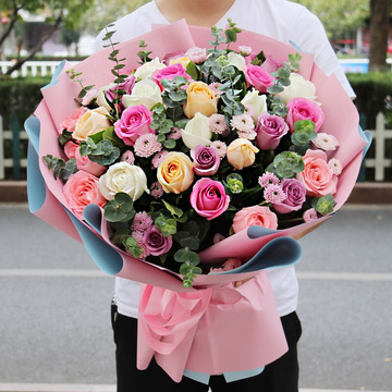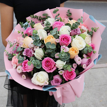 粉色蓝色双面欧雅纸圆形包装,粉色缎带束扎花语:想你想的睡不着觉,念你念的心怦怦直跳;恋你恋的鬼迷心窍,爱你爱的肉直往下掉。附送: