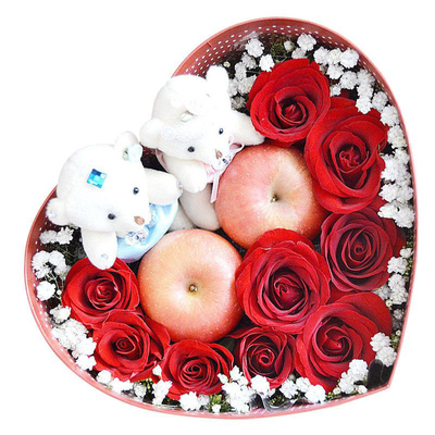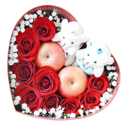 9朵红玫瑰,2个苹果,一对小熊,搭配满天星。