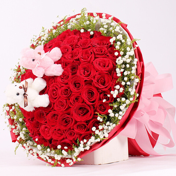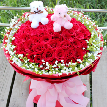 99枝红玫瑰,黄莺、满天星外围,随机赠送两只可爱小公仔