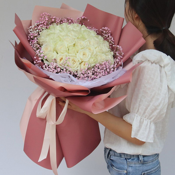 33支白玫瑰,粉色满天星丰满围边