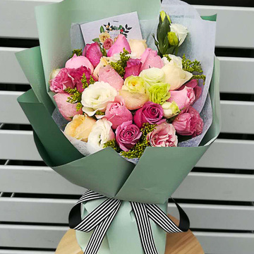 内衬白色棉纸,外层绿色欧雅纸层次扇形包装,条纹缎带束扎花语:“全世界我最想去的地方就是你的心里”附送: