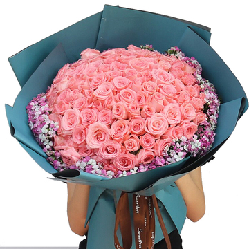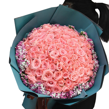 精选99朵戴安娜玫瑰,粉色相思梅丰满围边。