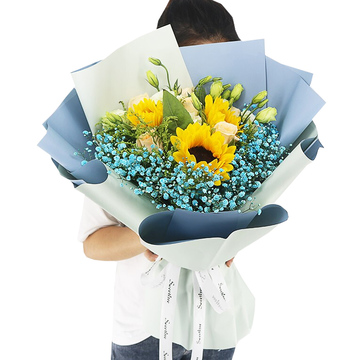 蓝色+淡绿色双面欧雅纸扇形包装,白色英文缎带束扎花语:你是个小太阳,明媚了匆匆时光附送:
