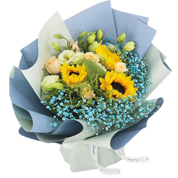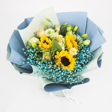 6朵香槟玫瑰+3支向日葵,蓝色满天星丰满,搭配绿桔梗