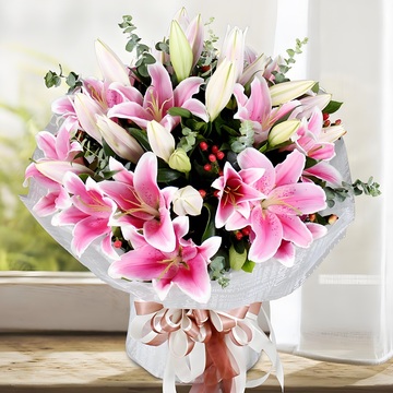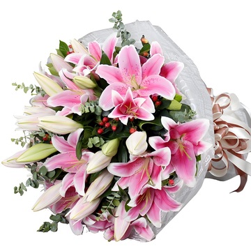 8枝多头粉百合,搭配适量尤加利、红豆、栀子叶