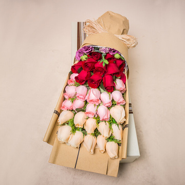 33朵玫瑰(11朵红11朵戴安娜粉11朵香槟),粉桔梗搭配,黄莺间插