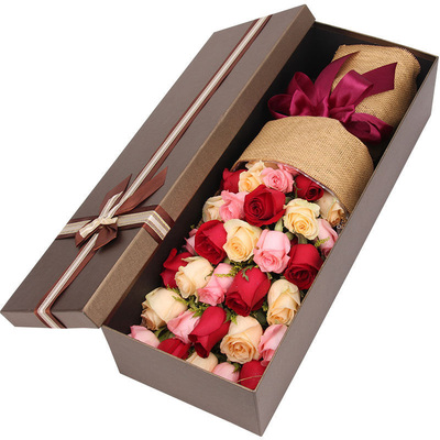 内层英文雾面纸,外层咖啡色细麻片包装,酒红色缎带束扎。咖啡色长方形礼盒。花语:于千万人之中与你遇见,与千万年之中,在时间无涯的荒野里,没有早一步,也没有晚一步,我们,刚巧遇上……附送: