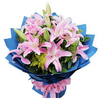 粉色粗麻布和粉色牛皮纸扇形包装,浅蓝色缎带束扎花语:时间在流逝,美好的回忆尤在;青春在变老,朴实的情感尤在;愿你的生活芬芳,花香清逸!附送: