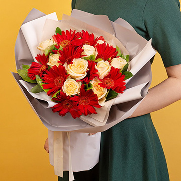 香槟玫瑰9枝、红太阳花11枝、栀子叶10枝
