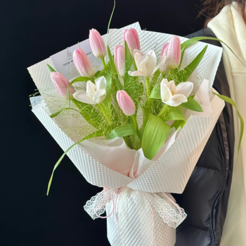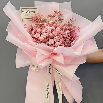 白色棉纸内衬,外层淡蓝色雾面纸包装,配蓝色条纹缎带系结束扎花语:我想要一辈子为你用尽我所有的好,不知道你是否能给我一次机会。附送: