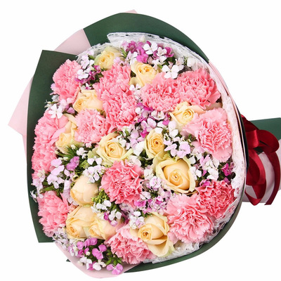 19支粉色康乃馨,12朵香槟玫瑰,搭配适量粉色石竹梅、黄莺