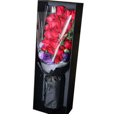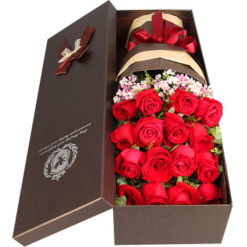 咖啡色及米白色牛皮纸扇形包装,红色缎带束扎。礼盒装花语:青春是美好的,不管是现在,还是暮年,你就是我的热血青春!附送: