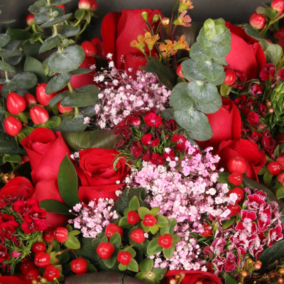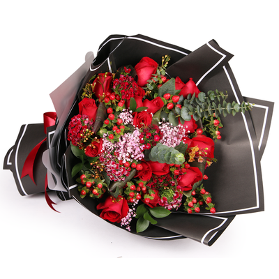 19支精品红玫瑰,搭配适量红色石竹梅、红豆、粉色满天星、尤加利。