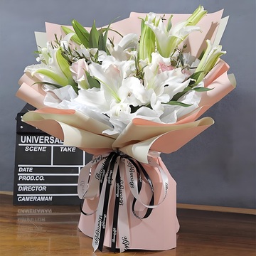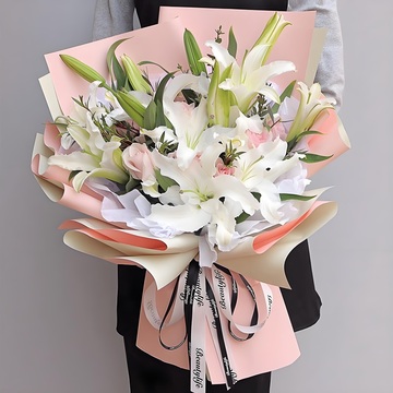 6枝多头白百合,6朵粉佳人玫瑰,绿叶搭配
