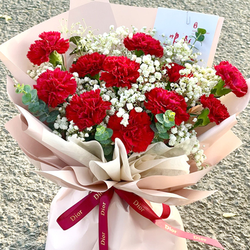 11支红康,白色满天星丰满间插,尤加利点缀