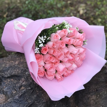 33朵戴安娜粉玫瑰,白色相思梅搭配