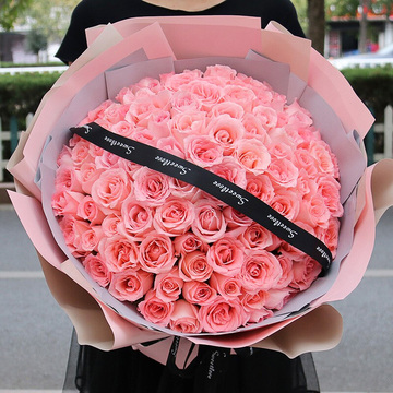 99朵戴安娜粉玫瑰,黑色英文缎带搭配