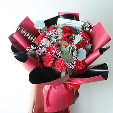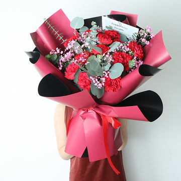 19支红色康乃馨,粉色满天星和尤加利搭配