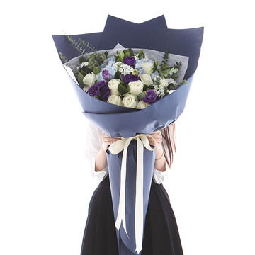 外层蓝色包装纸、内衬白色雪梨纸、米白色缎带束扎,做成熊抱花束。花语:爱着你,就像沐浴日光一般的温暖,看你纯净的眼神,就可以抵挡人生所有的微尘,这是属于我们的纯棉爱情!附送: