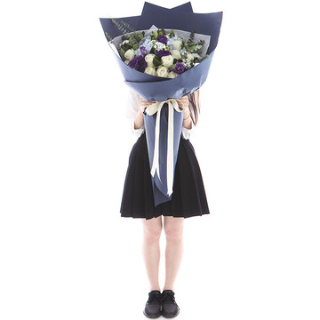 【熊抱花束】白玫瑰19枝、蓝绣球3枝、紫色桔梗5枝、白色石竹梅、搭配适量栀子叶、尤加利。