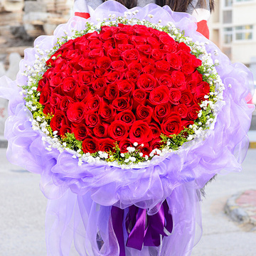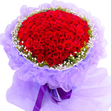 99朵红玫瑰,外围白色满天星,黄莺丰满搭配