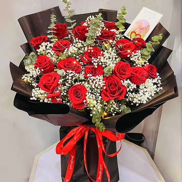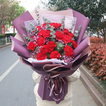 19朵红色康乃馨,粉色满天星+尤加利间插