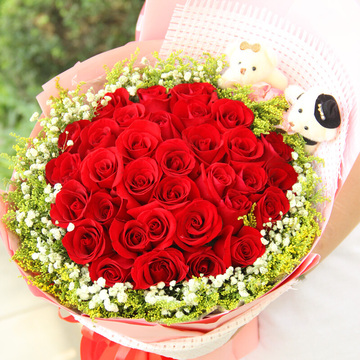 33朵优质红玫瑰,黄莺、满天星点缀,可爱小熊一对。