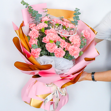 21朵粉色康乃馨,尤加利丰满,1个皇冠