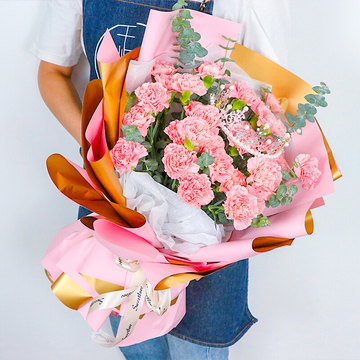 粉金色欧雅纸包装,白色缎带束扎花语:亲爱的母亲大人,感恩您温暖的爱附送:
