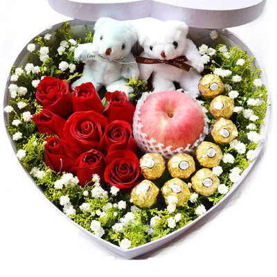 精选9朵精品红玫瑰+9颗费列罗巧克力+2个情侣小熊+1个苹果,四周满天星黄莺搭配。