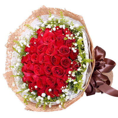33支精品红玫瑰,外围搭配适量白色满天星、黄莺。