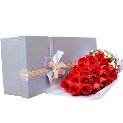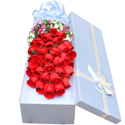 白色雾面纸包装,淡蓝色缎带束扎,精致礼盒包装。花语:我想你的时候最缠绵,无论我们相聚多远,前面的路有多坎坷,只想说:你是我今生最大的幸福。附送: