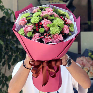 13朵粉色康乃馨,9朵绿色康乃馨,绿菊搭配,红豆点缀