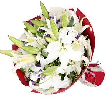 6枝多头白色香水百合,栀子叶、黄莺、勿忘我搭配。