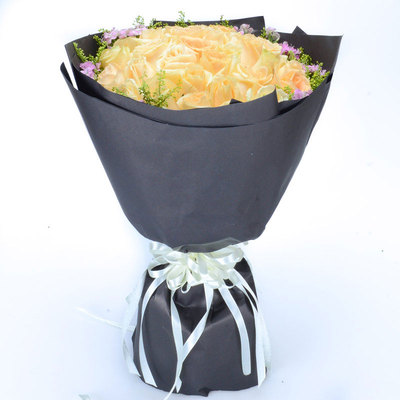 黑色手揉纸圆形包装,搭配美丽蝴蝶结花语:我想在五十年之后我一定还是像现在一样爱你。附送: