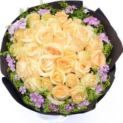 33枝上等香槟玫瑰,相思梅、加拿大黄莺外围点缀