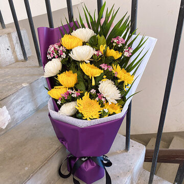 玻璃纸+红金色欧雅纸层次扇形包装,白色英文缎带束扎花语:你的身上散发出一种迷人的气息,那种气定神闲、自然清新的优雅,令人迷醉!附送: