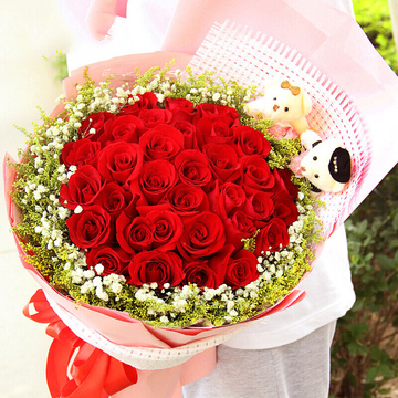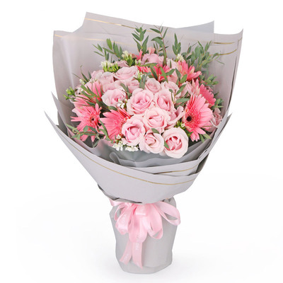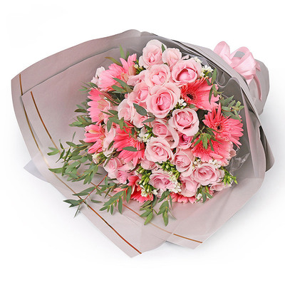 33朵戴安娜粉玫瑰,8朵粉色非洲菊,搭配白色相思梅、绿叶