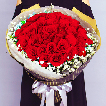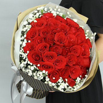 33朵红玫瑰,搭配满天星。