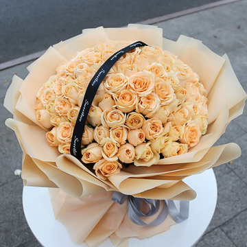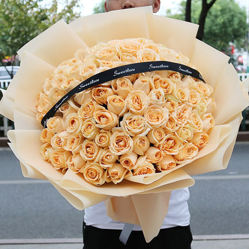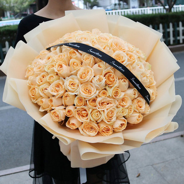 99朵香槟玫瑰,黑色英文缎带搭配