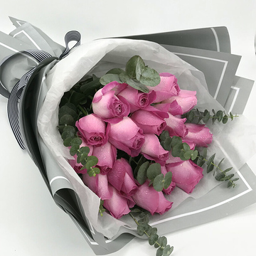 灰色包装纸扇形包装,黑白条纹缎带束扎。花语:遇见你是我生命中最美的回忆,你是如此的珍贵、独特,请接收我的浪漫与真情。附送:
