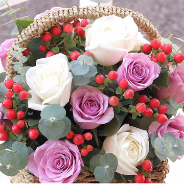 紫玫瑰、白玫瑰共19朵,红豆搭配,大尤加利叶丰满间插